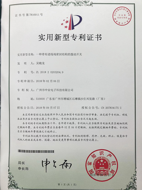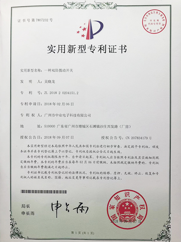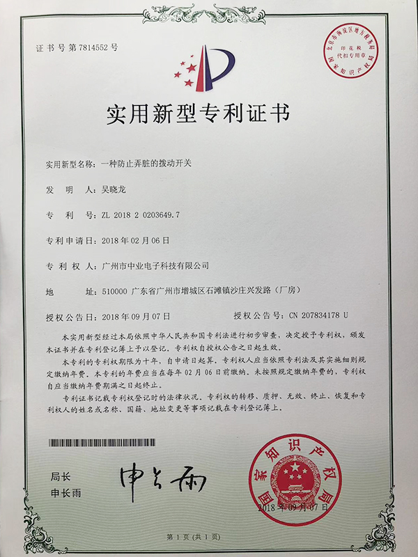 拨动开关专利认证